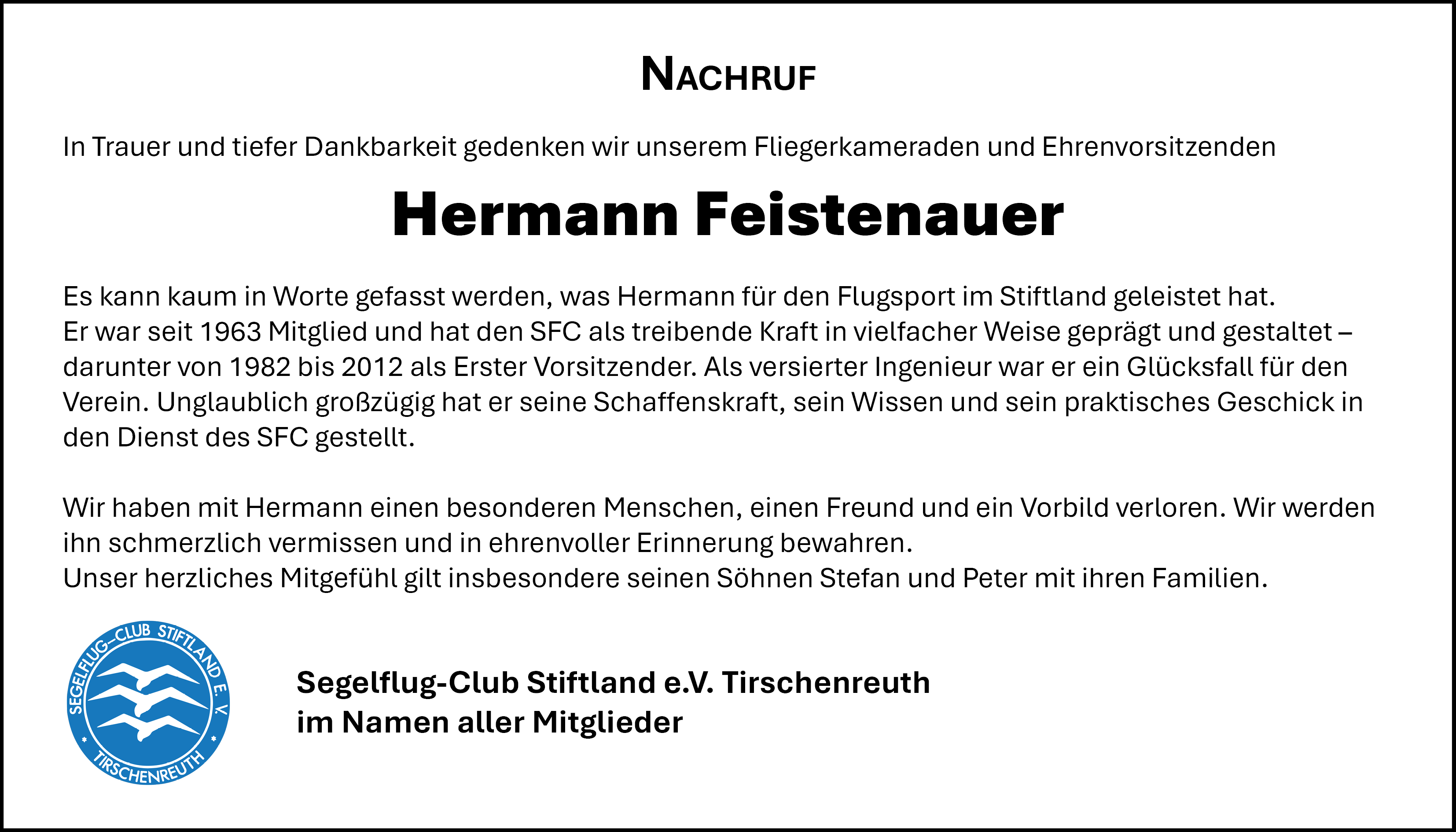 MehrIn Trauer und tiefer Dankbarkeit gedenken wir unserem Fliegerkameraden und Ehrenvorsitzenden Hermann Feistenauer. Es kann kaum in Worte gefasst werden, was Hermann für den Flugsport im Stiftland geleistet hat. Er war seit 1963 Mitglied und hat den SFC als treibende Kraft in...
